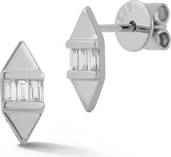 A trio of baguette diamonds twinkles from these hexagonal-shaped studs cast in icy 14-karat white gold.