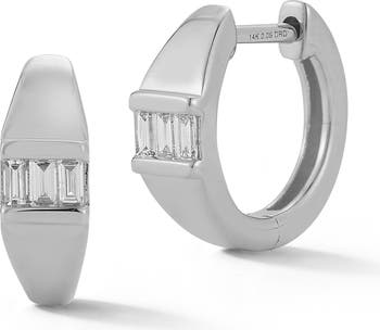 A trio of baguette diamonds twinkles from the center of these tapered hoop earrings cast in icy 14-karat white gold.