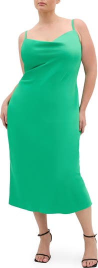 Sleek satin defines this elegant cocktail midi dress styled with a softly draped cowl neckline and adjustable straps. The curve-skimming column silhouette creates a clean, elongated line for a refined, sophisticated look.