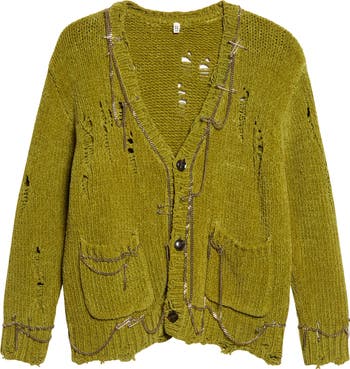 Chris Leba gives typically prim knitwear the '90s-grunge treatment in this cotton cardigan with threadbare rips, shredded edges and punk-coded accessories—think draped chains and safety-pin hardware.