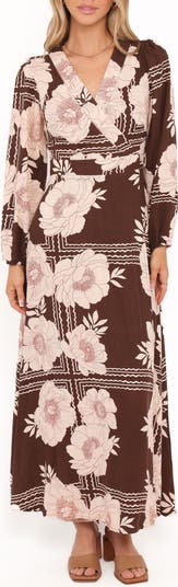 Tropical vibes exude from this floral midi with a faux-wrap bodice, waist tie and long, flowy skirt.