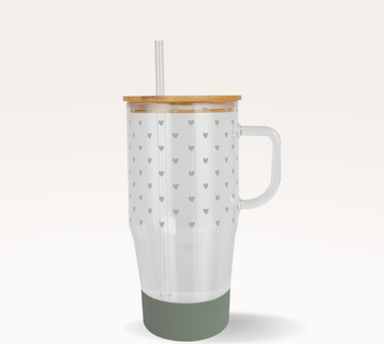 A 32oz glass tumbler featuring an allover mini hearts pattern in soft sage, applied using UVDTF printing, in which UV-cured inks are transferred directly onto the glass surface for a durable, glossy finish that does not peel or fade. Includes a natural lid with a removable silicone lid protector for a snug, spill-resistant seal, a clear glass straw, and a matching sage food-grade silicone boot cover that protects the base from scratches and impact. Made from lead-free, BPA-free borosilicate glass with an integrated handle. Designed and produced in Lafayette, Louisiana by a women-owned team. Suitable for hot and cold beverages. Ships in 1 to 3 business days.