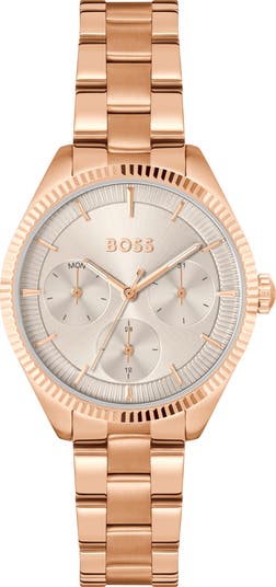 A textured bezel and trio of subdials enhance the minimalist appeal of this sophisticated timepiece housed on a coordinating link bracelet.