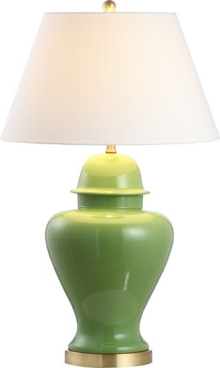 Our modern take on Chinoiseries features a solid apple-green glaze on a porcelain base. This pair of lamps is perfect for a bedroom, living room, or entry console. The traditional ginger jar shape exudes Hollywood Regency style, while brass fittings suit modern interiors. The silk-wrapped cord is an upscale touch. Includes an energy-saving LED bulb.