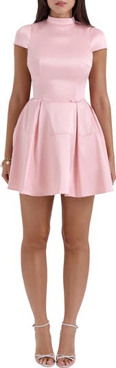 Love to twirl in this glossy satin mini designed with shaping darts for a fitted bodice and sharp pleats enhancing the skirt's flare.