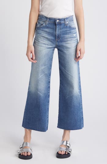 Wide legs and raw hems bring retro-chic style to these high-waisted jeans kept comfortable with a bit of stretch.