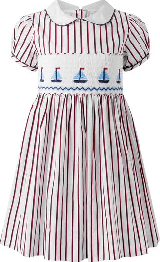 Classic and charming with a playful nautical twist, the Sailboat Smocked Stripe Dress is a timeless style designed for sunny days and seaside adventures. Crafted from crisp cotton, the dress features elegant vertical stripes in red and navy set against a soft ivory background, creating a refined yet cheerful look.