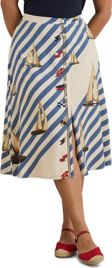 Diagonal stripes overlaid with sailboats and a rope-style border waving with flags emphasize the nautical inspiration of this button-front midi skirt