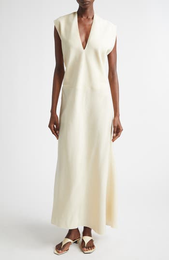 A yoke and cap sleeves frame an open back on this fluid dress cut from a drapey fabrication woven with a touch of silk.