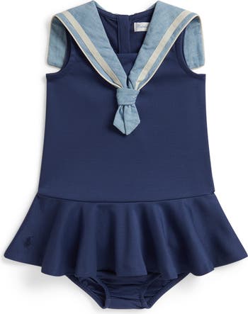 Baby will be serving nautical charm in this indigo-dyed dress-and-bloomers set made of stretch-enhanced ponte and topped by a chambray sailor collar.