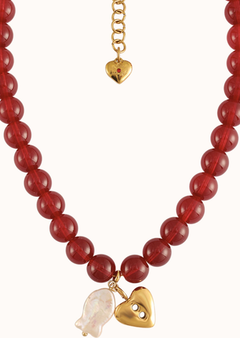 A playful nod to summer days by the water. The Sailor Necklace strings together red glass beads and real freshwater pearls, finished with a gold-plated stainless steel clasp. At the center, our signature heart charm — inspired by Reilly's bikini embellishments.