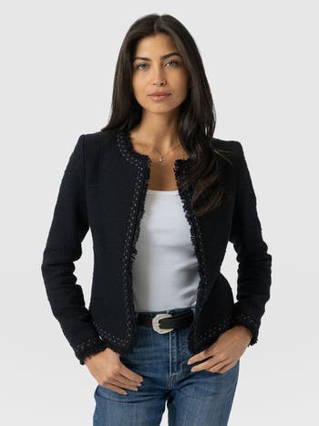 Buy the Rayner Jacket Bouclé. A beautiful, tailored jacket for a smart, sophisticated look. Designed in our London studios and handmade in Europe with a panel detailed boucle fabric and crest shank buttons in silver. From our Women's Jackets here at Saint and Sofia.