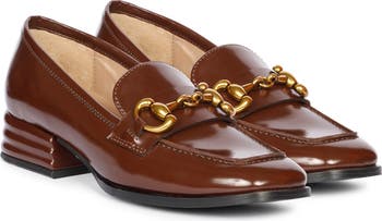 Polished bit hardware and a loafer-inspired topline add sophisticated elements to a glossy leather pump balanced by a squared-off moc toe and sculptural block heel.