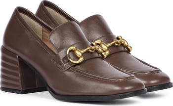 Brushed bit hardware and a loafer-inspired topline enrich a sophisticated leather pump balanced by a squared-off moc toe and sculptural block heel.