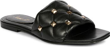 Gleaming pyramid-shaped studs highlight the diamond quilting on the vamp of this slide sandal crafted in supple leather and furnished with a padded footbed.