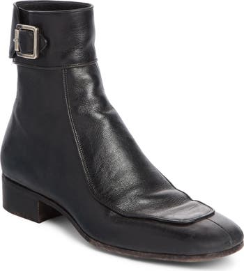 Vintage-inspired piecing and a belted cuff style a squared-toe boot handmade in Italy.