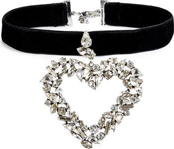 Shimmering rhinestones in a variety of cuts brighten the chunky heart pendant on this velvety choker necklace.