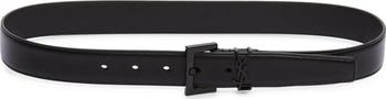 A black buckle and YSL monogram keeper extend the low-key luxe look of this leather belt with a monochromatic palette.