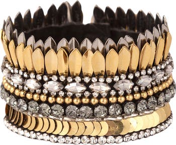 Gleaming discs and sparkling crystals create a stacked look on this hand-embellished magnetic bracelet backed by soft suede.