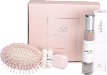 The Sakura Tokyo Eau de Parfum blends airy notes of Nashi Pear, Neroli, and Sakura with soft florals and a powdery, sensual finish, evoking the charm of cherry blossoms in bloom. Enjoy a Pink Mini Oval Hair Brush and an Ivory Silk Scrunchie.