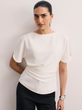 Inspired by the bestselling dress of the same name, the Clever Crepe Salerno top features beautiful curved sleeves that fall open like flower petals. It’s gathered into the side of the waist and cut a bit shorter in the body so that it sits at a flattering point on the hips, lending itself to all your favourite pants.