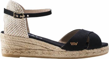 Salina: low wedge ankle strap espadrillesA low wedge, a delicate ankle strap and a crossed open toe. These elegant and comfortable canvas espadrilles sit on a sturdy 2” heel and a comfortable, natural jute wedge. Their pretty cross-band toe box will turn heads. Made of 100% organic canvas and natural jute, they also feature a soft, padded innersole for extra comfort. Step out in style with Salina.