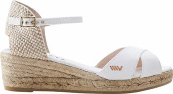 Salina: low wedge ankle strap espadrillesA low wedge, a delicate ankle strap and a crossed open toe. These elegant and comfortable canvas espadrilles sit on a sturdy 2” heel and a comfortable, natural jute wedge. Their pretty cross-band toe box will turn heads. Made of 100% organic canvas and natural jute, they also feature a soft, padded innersole for extra comfort. Step out in style with Salina.