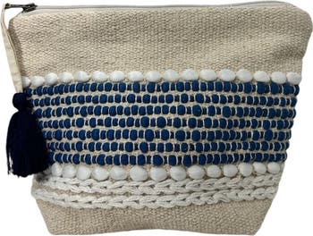 This multifunctional beach pouch, crafted from hand-knotted cotton and jute, offers both practicality and vibrancy. Ideal for traveling, it features a secure zip closure and is perfectly sized to accommodate personal belongings, such as a cell phone, keys, makeup, or even a damp swimsuit.
