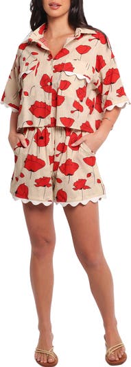 Make vacay packing a breeze with this rickrack-trimmed set featuring a poppy-printed button-up and matching shorts that multiply your outfit options as you wear them together and pair them with more separates.