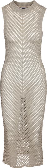 Airy open stitching and a sheer design brings breezy charm to this crewneck sweater-dress knit to a midi length.