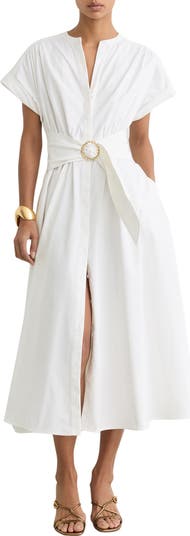 An attached belt with gleaming hardware hugs your curves perfectly as you breeze through your day in this stretch-enhanced-cotton midi dress made with pockets.