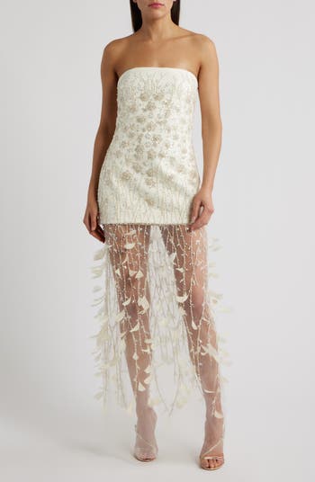 Intricate beading and delicate feathers define the sheer overlay of this showstopping strapless gown.