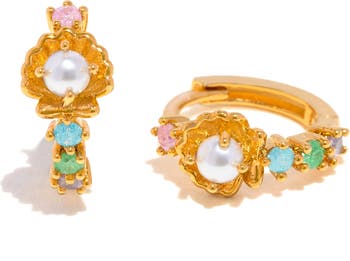 Evoke the beauty of the sea with these dainty hoop earrings lined in colorful cubic zirconia and a faux-pearl centered clam.