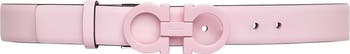 A tonal double-Gancio buckle creates a sleek look on a pastel-pink calfskin leather belt that adds a pop of color to any ensemble.