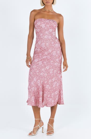 Sweeten the occasion in this flowery maxi designed in a sleek strapless silhouette with a drapey hem.