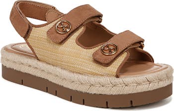 Gleaming hardware adorns the straps of an adjustable woven sandal fitted with a cushioned footbed for comfort and style.