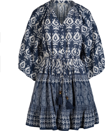 Our Sam Dress is a breezy mini with a V-neckline and blouson three-quarter bell sleeves. The elastic waist features a drawstring tie finished with tassels and beads, letting you personalize the fit. A playful flounce at the hem completes the look, and yes, it has pockets (of course). The button-front placket adds a polished touch. Pair with sneakers or flats for a one-and-done look from weekends to getaways, or wear it as a seasonal transitional piece on vacation or at home.