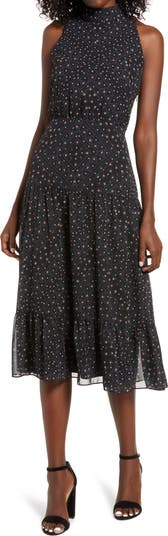 A ditsy floral and bandana print brings boho charm to this flouncy chiffon dress with a shoulder-flaunting bodice and a high tie-back neckline.