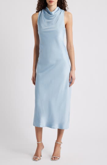 Sophisticated elegance is easily achieved in this cowl-neck maxi dress cut from satin fabric that gives off liquid-like shine.