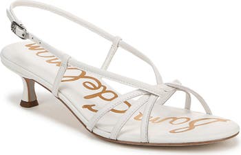 Tubular straps intertwine over the vamp of a slingback sandal set on a tapered kitten heel for modern style and a hint of lift.