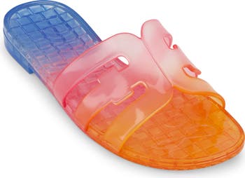 Geometric cutouts and a colorful ombré design lend visual intrigue to a kid-sized slide sandal that your little one is sure to love.