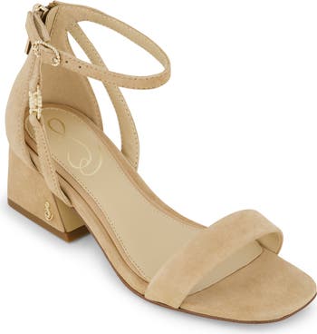 Gleaming logo hardware and a creamy suede upper add stylish charm to a minimalist sandal fitted with a back zip for easy entry.