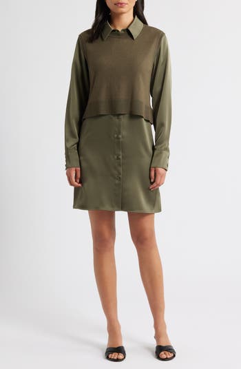 Achieve a classic layered look with this style that pairs a silky long-sleeve shirtdress with a tonal sweater vest.