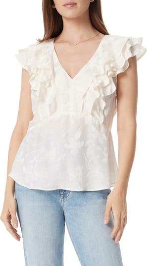 Charm endlessly in this lightweight peplum top elevated with satiny tonal blooms and luscious layered ruffles.