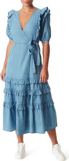 Ruffle trim at the shoulders and skirt adds abundant charm to this airy wrap dress.