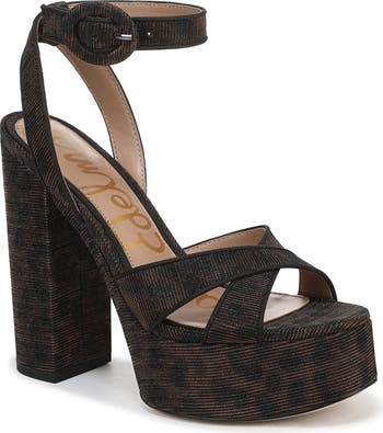 Tapered straps crisscross over the vamp of a '70s-inspired platform sandal lofted by a soaring block heel and secured with an adjustable buckle closure.