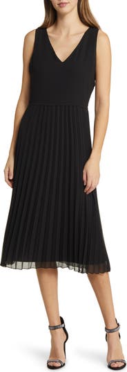 An accordion-pleated skirt lends graceful movement to this sleeveless midi that's balanced by a fitted V-neck bodice.