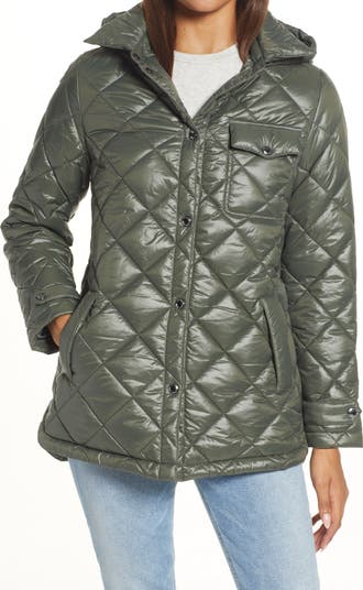 You'll be a cold-weather standout in this sleek diamond-quilted jacket complete with a water-repellent finish and removable hood.