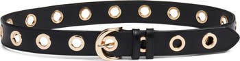 Glinting rivets highlight the geometric buckle and smooth leather exterior of an opulent belt that adjusts for a customized fit.