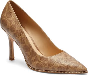Signature C logos bring bold heritage branding to this coated-canvas pump boasting a supersharp pointy toe and gilded beading glimmering along the perimeter.